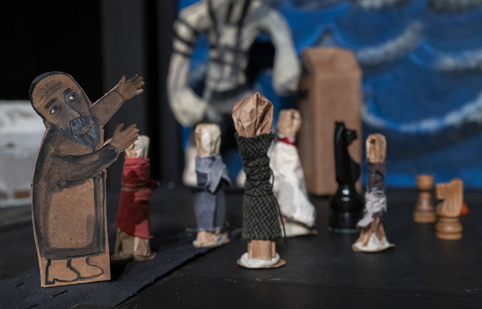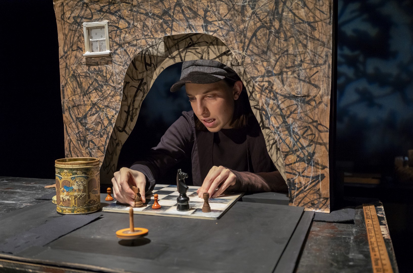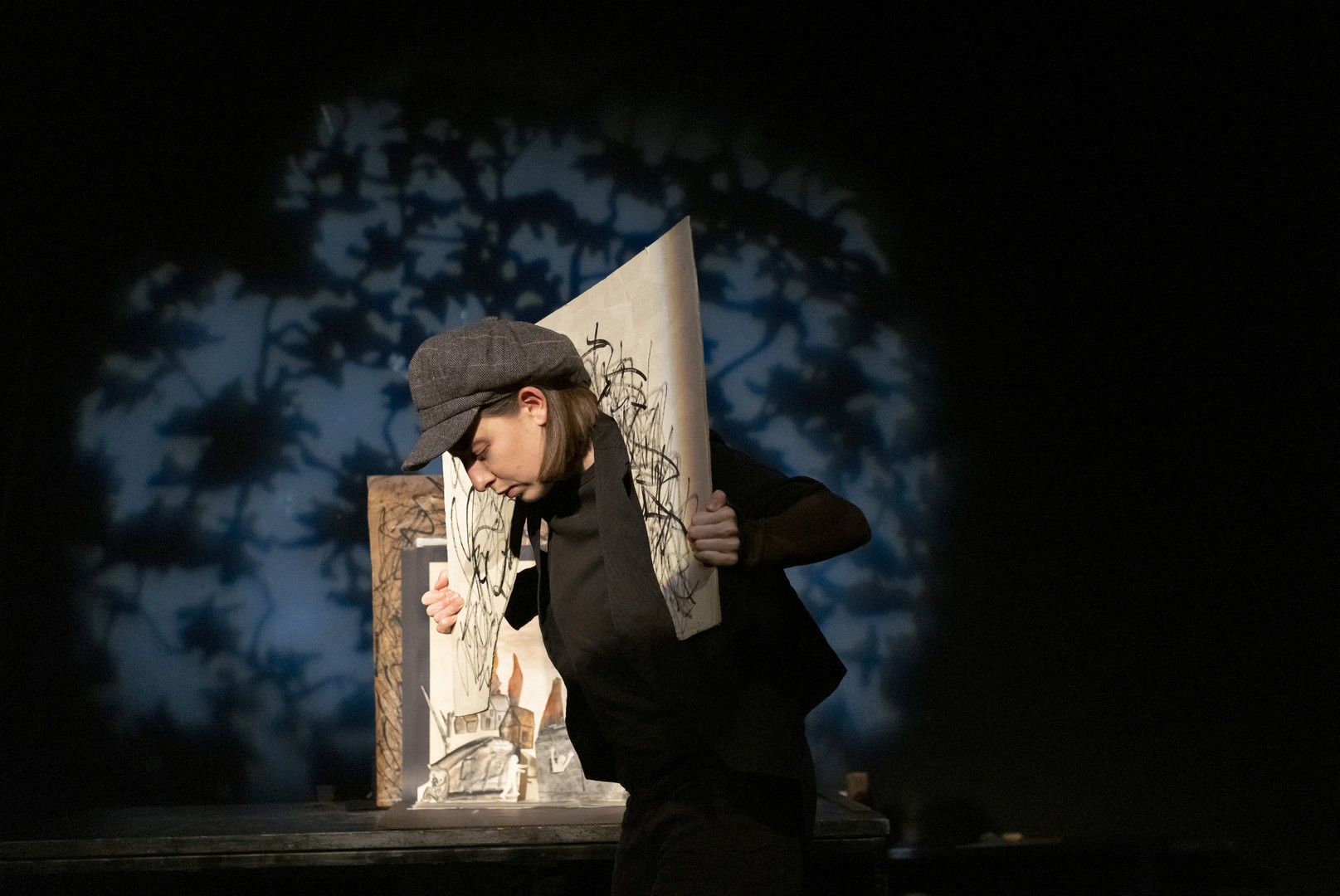 In the performance, Tina Resman (Hershel) carefully constructs a small street out of cardboard houses. They appear fragile, as if breathing under the actress's fingers. The vocabulary of silence at this moment conveys more than words in a dream scene, as the magic of sounds awakens the boy's imagination. The puppets, made of paper, cardboard, and recycled materials, retain visible traces of their past use. In this way, the performance represents the ethics of reusing objects, which helps us to better accept and understand our past.
