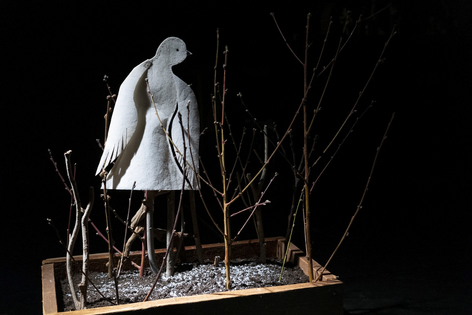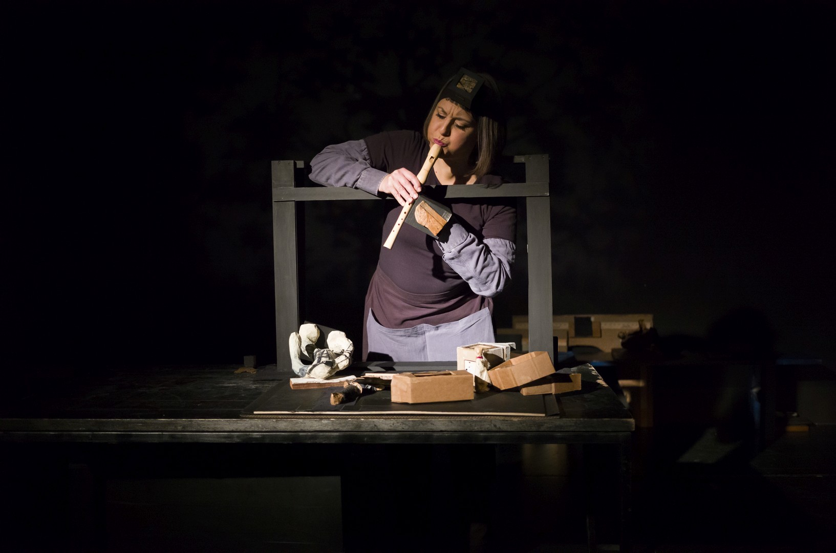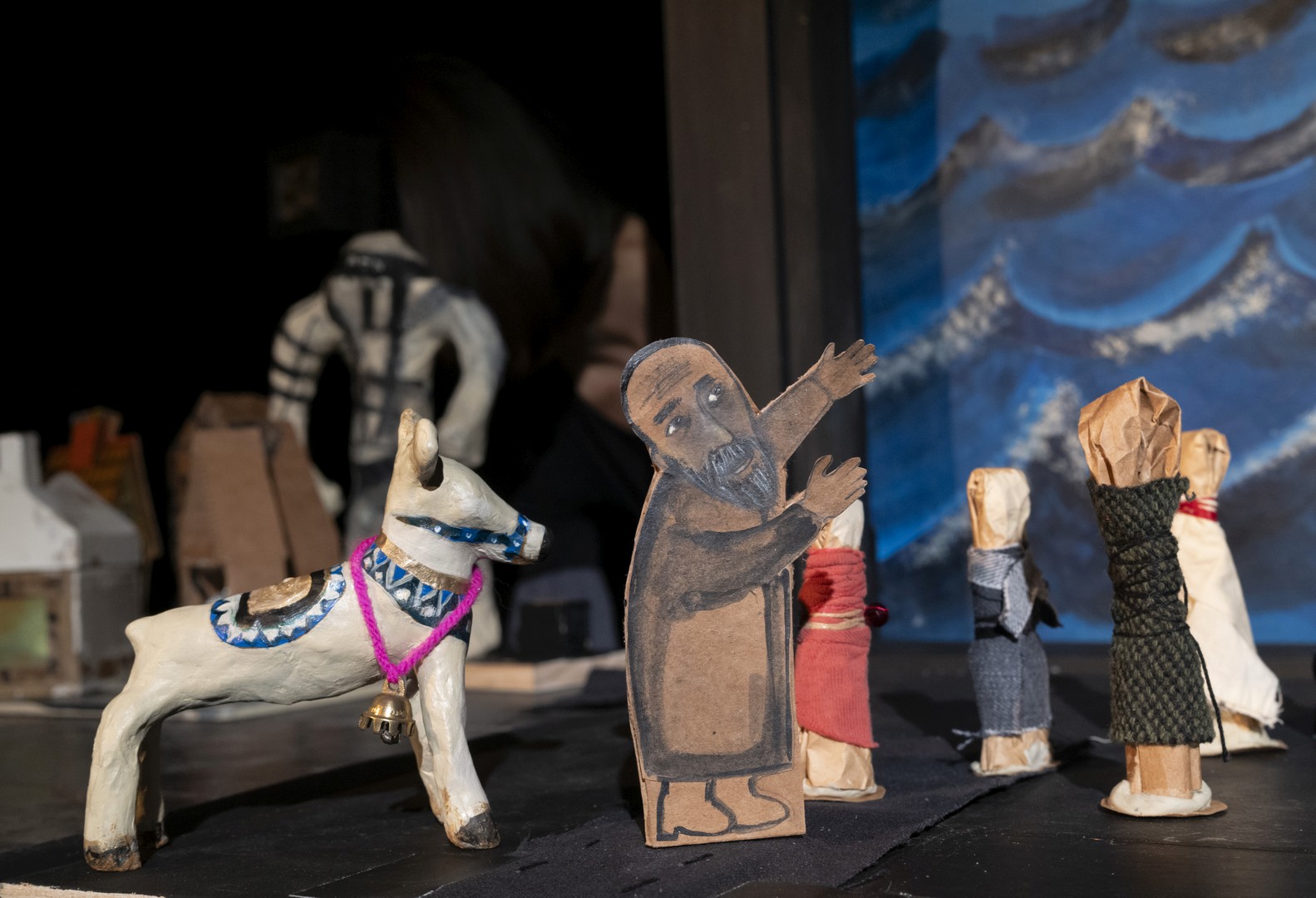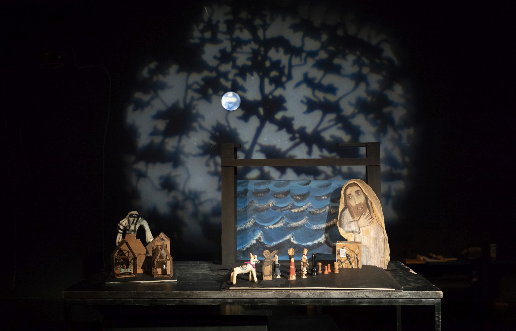 In the performance, Tina Resman (Hershel) carefully constructs a small street out of cardboard houses. They appear fragile, as if breathing under the actress's fingers. The vocabulary of silence at this moment conveys more than words in a dream scene, as the magic of sounds awakens the boy's imagination. The puppets, made of paper, cardboard, and recycled materials, retain visible traces of their past use. In this way, the performance represents the ethics of reusing objects, which helps us to better accept and understand our past.